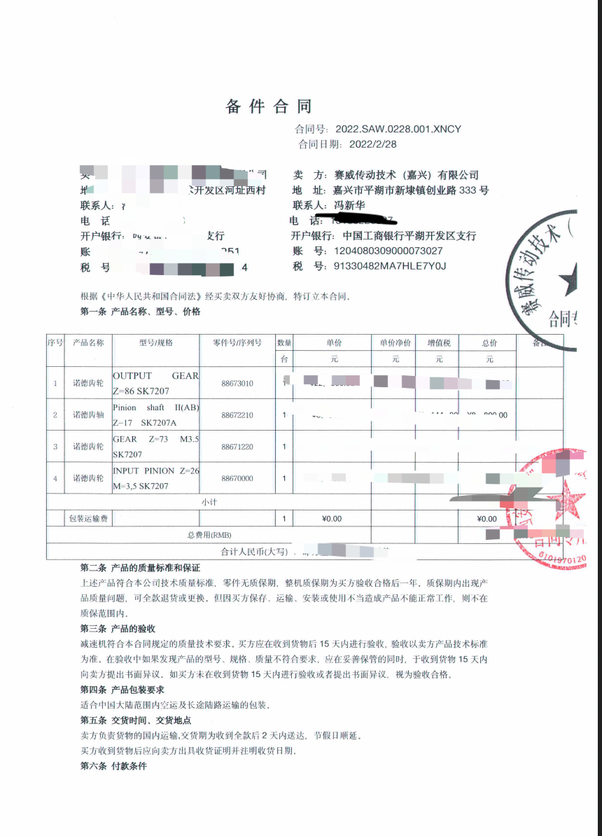 2022年2月26日23:10西安某客户急需诺德SK7027V减速机配件,那天刚好是周末,诺德NORD减速机工厂周末不上班,所以只好说得等周一确定,客户要求周日确定有没有现货,由于这个是老朋友,所以周日拖售后技术确定是有现货的,2月28日上午确定价格随后签订合同,下午我就赶往苏州工厂提货,由于五点后到达苏州工厂,货提不出来,只好等第二天3月1日早上提货,随后3月1日早上九点拿到货,由于客户想和我见一面,所以直接从苏州赶往西安送货,下午三点出发,知道3月2日下午一点到达,客户见到货后非常满意,感谢客户信任。